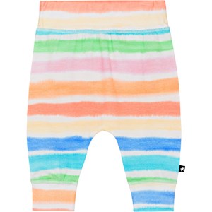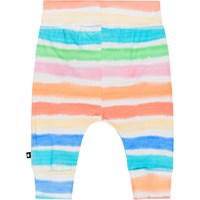 Kleurrijke gestreepte babybroekje van biologisch katoenen jersey. De broek heeft een brede elastische ribboord rond de taille en pijpen en zichtbare stiksels aan de voorkant, waardoor de broek de look van een joggingbroek krijgt. Het is zacht en comfortabel. Voor een complete jersey set kun je het dragen met een bijpassend shirt.
