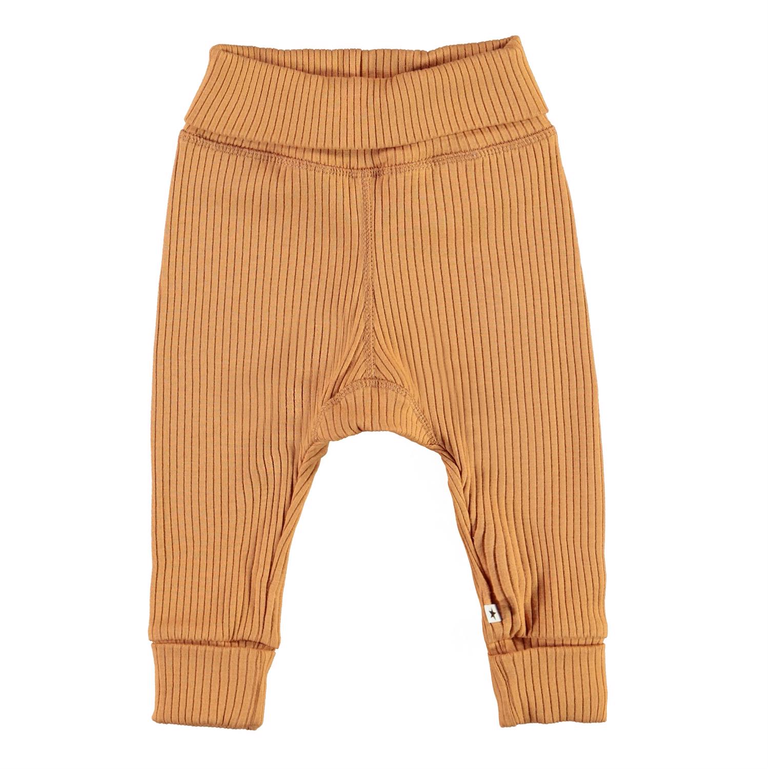 San is een bruine babybroek in een rib kwaliteit. Het heeft breed elastiek rond de taille en pijpen. De taille en de pijpen zijn omgeslagen. Draag het met een bijpassende shirt. Dit Molo-product is gemaakt van 100% biologisch katoen.
