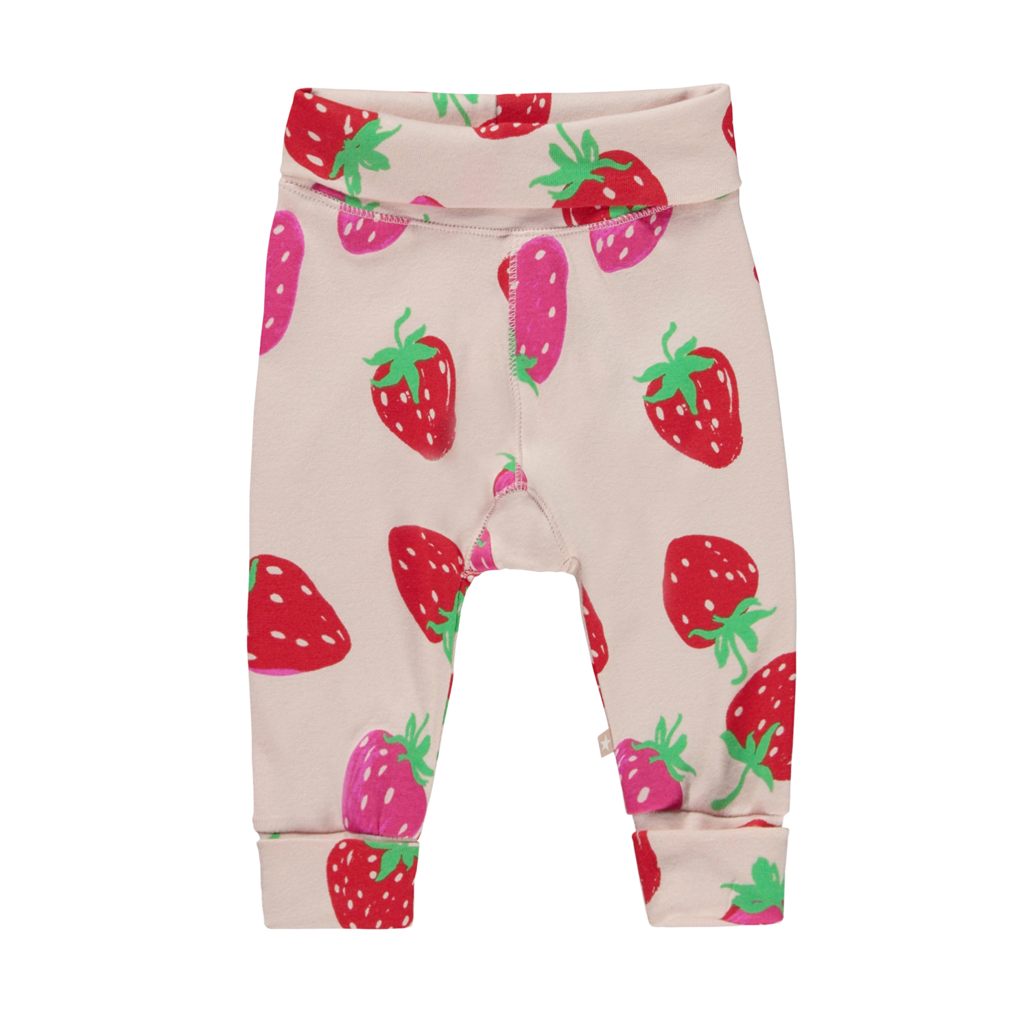 San is een roze babybroek met een aardbeienprint. Het heeft een breed, opgerold elastiek rond de taille en enkels.
