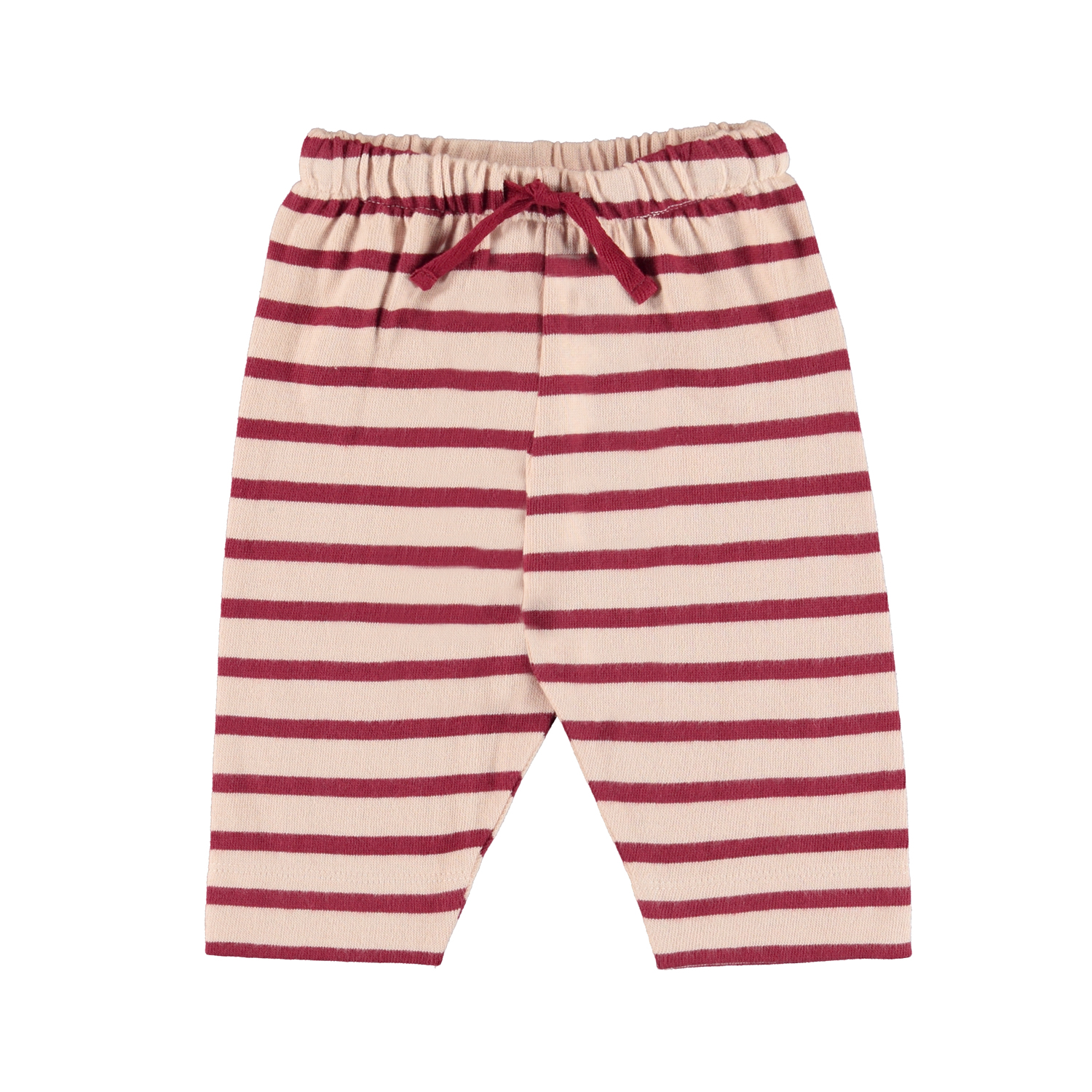 Saxon is een lichtroze gestreepte babybroek met rode streepjes Het heeft wijde pijpen en koordjes in de taille. Draag het met de bijpassende sweatshirt.