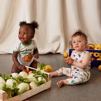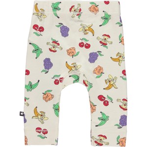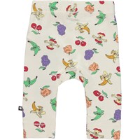 Seb is een beige babybroek met een komische fruitprint en smalle pijpen. De broek heeft elastiek in de taille voor een goede en comfortabele pasvorm.