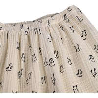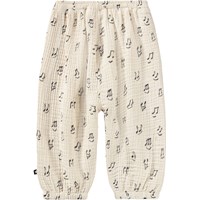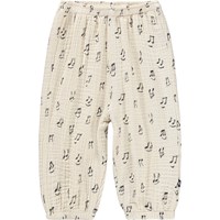 Crèmekleurige broek voor de kleintjes gemaakt van biologisch katoen met een muziekprint. Ze hebben een losse pasvorm, een elastische taille en elastiek bij de enkels, waardoor ze gemakkelijk aan en uit te trekken zijn. De broek is licht en comfortabel, wat ze perfect maakt voor dagelijks gebruik.