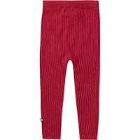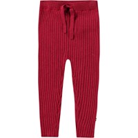 Donkerrode gebreide broek van viscose/kasjmier voor baby's en peuters. De broek zit aangesloten en heeft een geribbeld effect. Het heeft zowel een elastische tailleband als een koordje, waardoor het comfortabel is om te dragen en gemakkelijk is om aan te trekken.