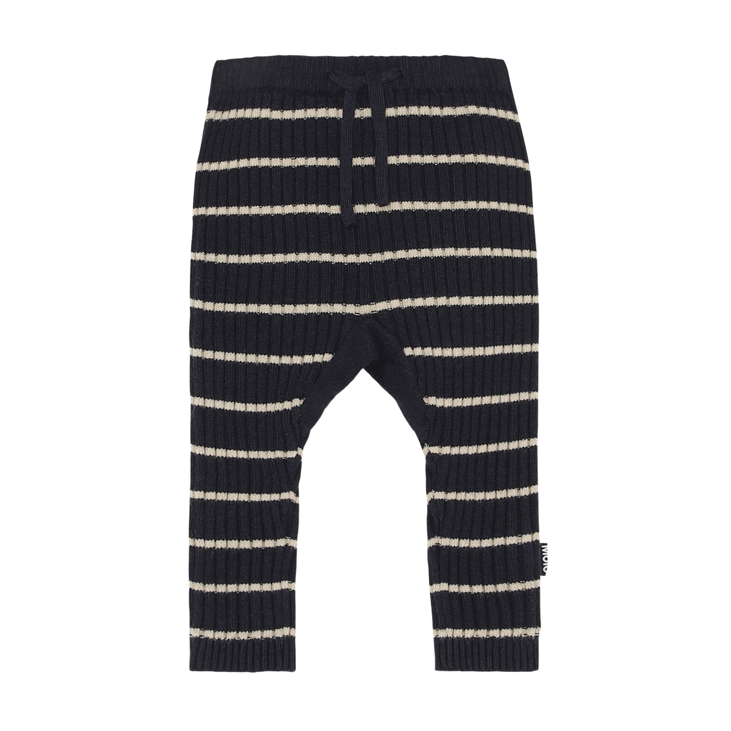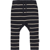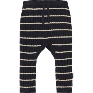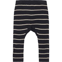 Sigmund is een blauwe gebreide baby ribbroek met smalle witte streepjes. Het heeft koordjes in de taille en de pijpen kunnen opgerold worden.