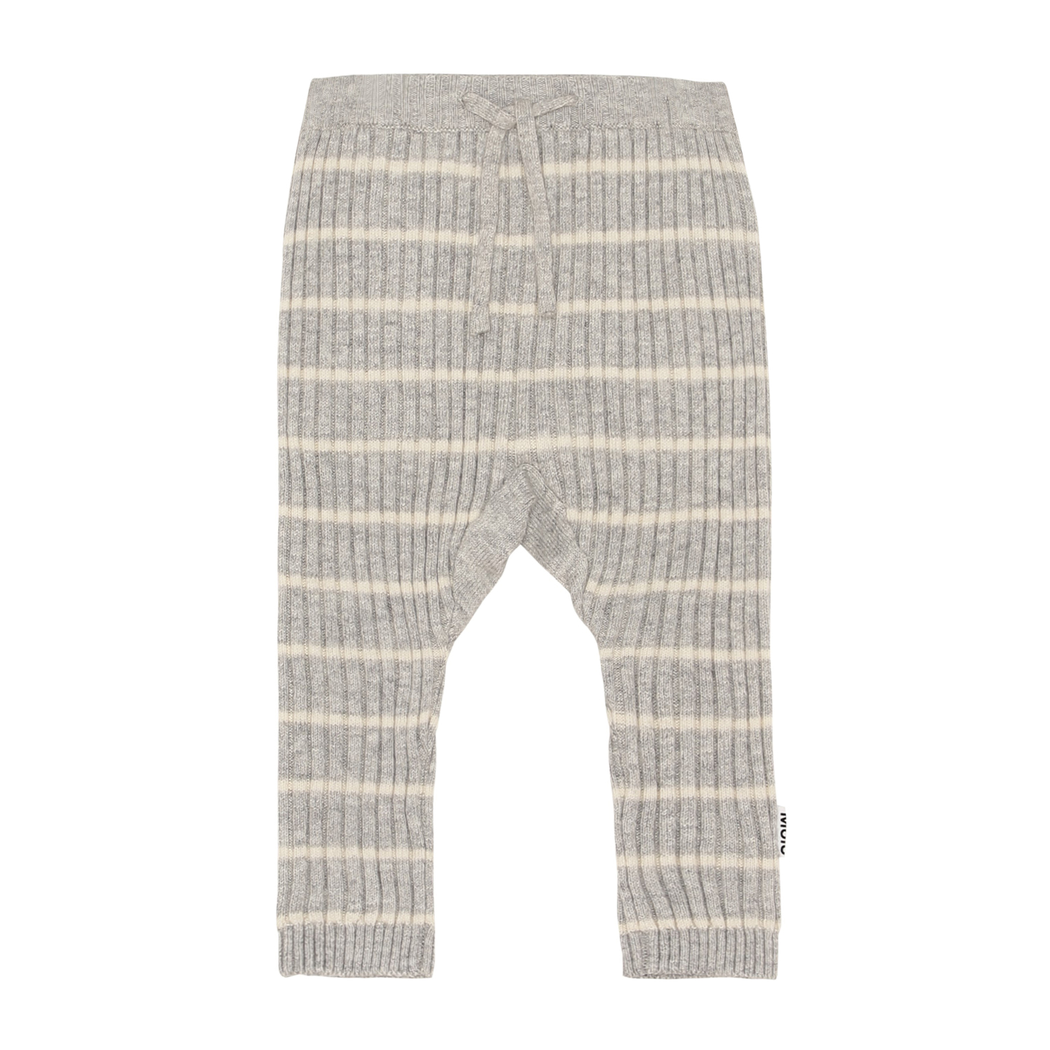 Sigmund is een grijze gebreide baby ribbroek met smalle witte streepjes. Het heeft koordjes in de taille en de pijpen kunnen opgerold worden.