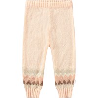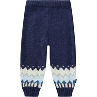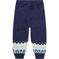 Donkerblauwe gebreide broek van zachte wolmix voor baby's en peuters. De broek heeft een Noors geïnspireerd patroon op de pijpen en rib rond de taille en pijpen.