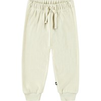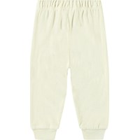 Voor baby's en peuters een gebroken witte joggingbroek van biologisch katoenen fluweel met een gevoerde binnenkant, waardoor het aangenaam koel blijft op warme dagen. De broek heeft zowel een elastische tailleband als een koordje, evenals rib boorden rond de pijpen, waardoor het gemakkelijk aan en uit te trekken is en veel bewegingsruimte geeft.