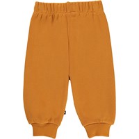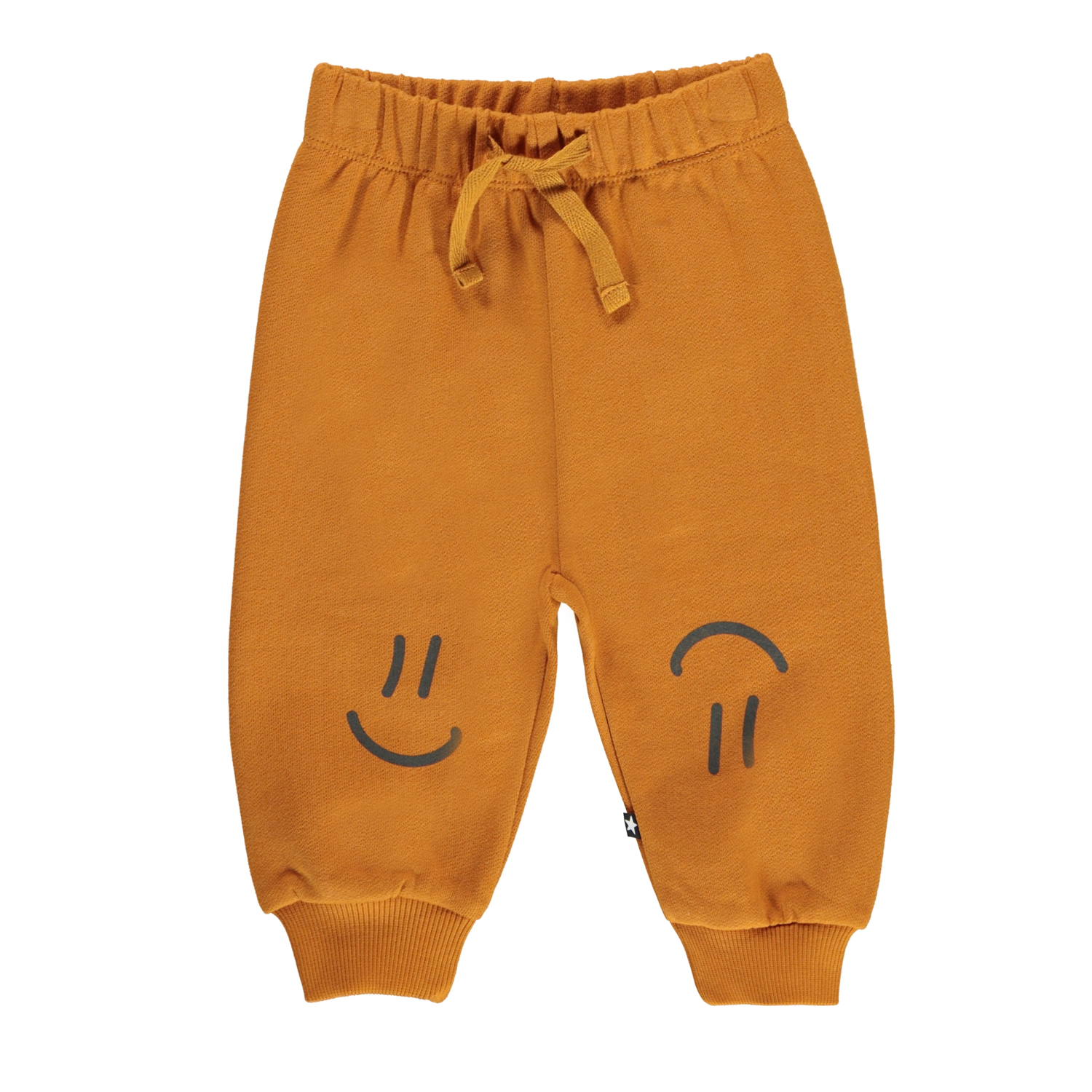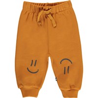 Simeon is een oranje baby joggingbroek met op de pijpen een print van smileys. Het heeft een elastische taille met koordjes.