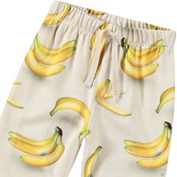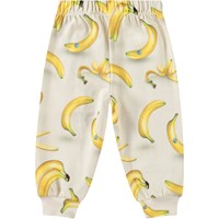 Zachte broek van biologisch katoen voor de kleintjes. De broek heeft een elastische taille met koordje en ribboor rond de enkels. Het is gemakkelijk aan en uit te trekken, waardoor je veel bewegingsvrijheid heeft. Deze stijl heeft een ongeborstelde binnenkant, waardoor het aangenaam koel is op een warme dag. De broek is beige met een bananenprint. Combineer het met de bijpassende sweater voor een complete outfit.