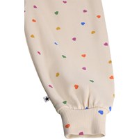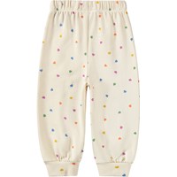 Zachte, witte joggingbroek voor de kleintjes gemaakt van biologisch katoen met een hartjesprint. De joggingbroek heeft elastiek en een trekkoord in de taille, geribde randen bij de enkels en een onbewerkte binnenkant.