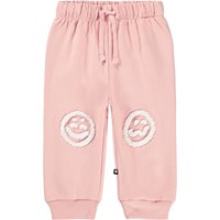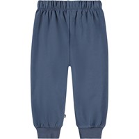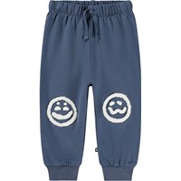 Zachte biologische katoenen broek voor de kleintjes. De broek is donkerblauw met zachte witte gezichtjes in verschillende stemmingen op de knieën. De broek heeft elastiek en een koordje in de taille en ribboorden rond de pijpen. Het is makkelijk aan en uit te trekken en biedt veel bewegingsruimte. Combineer het met de bijpassende sweater voor een complete outfit.