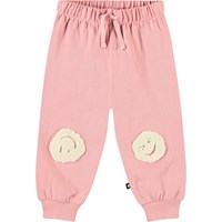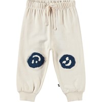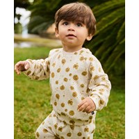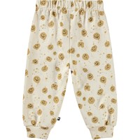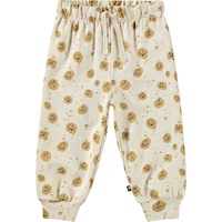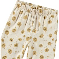Zachte broek van biologisch katoen voor de kleintjes. De broek heeft een elastische taille met koordje en ribboor rond de enkels. Het is gemakkelijk aan en uit te trekken, waardoor je veel bewegingsvrijheid heeft. Deze stijl heeft een ongeborstelde binnenkant, waardoor het aangenaam koel is op een warme dag. De broek is beige met een all over print van bruine smiley's. Combineer het met de bijpassende sweater voor een complete outfit.