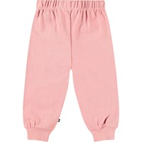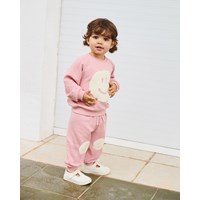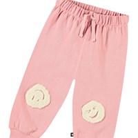 Zachte broek van biologisch katoen voor de kleintjes. De broek heeft een elastische taille met koordje en ribboor rond de enkels. Het is gemakkelijk aan en uit te trekken, waardoor je veel bewegingsvrijheid heeft. Deze stijl heeft een ongeborstelde binnenkant, waardoor het aangenaam koel is op een warme dag. De broek is roze met een zachte smiley op de knietjes. Combineer het met de bijpassende sweater voor een complete outfit.