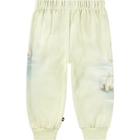 Voor de baby's en peuters een lichtgele joggingbroek van biologisch katoen met een gevoerde binnenkant, waardoor het koel blijven op warme dagen. De broek heeft zowel een elastische tailleband als een koordje, evenals ribboord rond de pijpen, waardoor het gemakkelijk aan en uit te trekken is en veel bewegingsruimte geeft. Het heeft een schattige prin van ijsbeerwelpen die in de sneeuw ravotten.