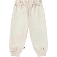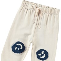 Zachte broek van biologisch katoen voor de kleintjes. De broek heeft een elastische taille met koordje en ribboor rond de enkels. Het is gemakkelijk aan en uit te trekken, waardoor je veel bewegingsvrijheid heeft. Deze stijl heeft een ongeborstelde binnenkant, waardoor het aangenaam koel is op een warme dag. De broek is lichtbeige met een zachte blauwe smiley op de knietjes. Combineer het met de bijpassende sweater voor een complete outfit.