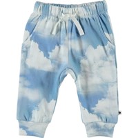 Simme is een zachte en comfortabele babybroek in de kleur blauw met wolkenprint. het heeft koordjes in de taille en zakken aan de zijkanten.