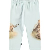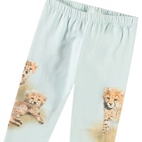 Broek van biologisch katoenen jersey voor de kleintjes. Het is aansluitend met een elastische taille. De broek is lichtblauw met een print van cheetawelpen op de pijpen.