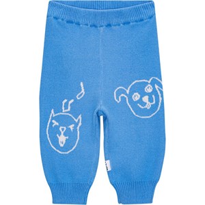 Zachte blauw gebreide broek van biologisch katoen. Het heeft een elastische taille met koordje en ribboord rond de pijpen. Het is comfortabel en gemakkelijk aan te trekken en je kan je er makkelijk in bewegen. De broek heeft een intarsia-omtrek van een hond en een zingende kat. Voor een complete set kan deze stijl worden gekocht met het bijpassende vest.