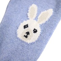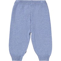 Lichtblauwe gebreide broek voor de kleintjes gemaakt van zacht geribbeld katoen en wol met een konijn en olifant op de knieën. De broek heeft een elastische tailleband om het makkelijk aan en uit te trekken en ribboorden rond de pijpen. Combineer het met de bijpassende trui voor een complete set.