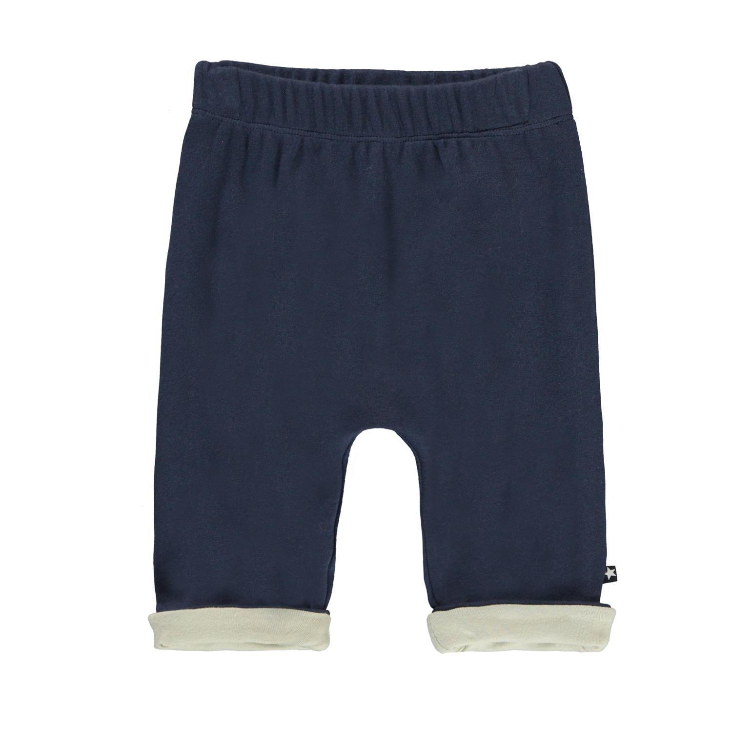 Soyo is een blauwe baby joggingbroek met een elastische taille en omgeslagen pijpen. De broek heeft een ruimvallende pasvorm.