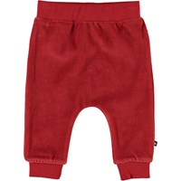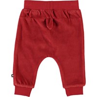 Stein is een ruime baby joggingbroek in rood fluweel. Het heeft een comfortabele pasvorm met een elastische taille en brede ribboorden rond de enkels.