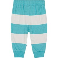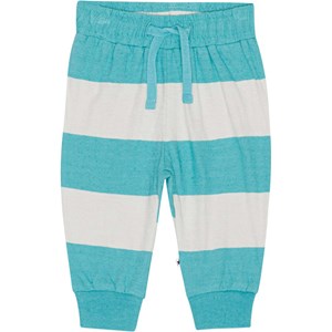 Baby joggingbroekje van een katoenmelange mix met blauwe en zandkleurige strepen Het heeft een elastische taille met koordje en ribboord rond de pijpen. Het is comfortabel en gemakkelijk aan te trekken en je kan je er makkelijk in bewegen. Dit model kan als complete set met het bijpassende t-shirt worden gekocht.