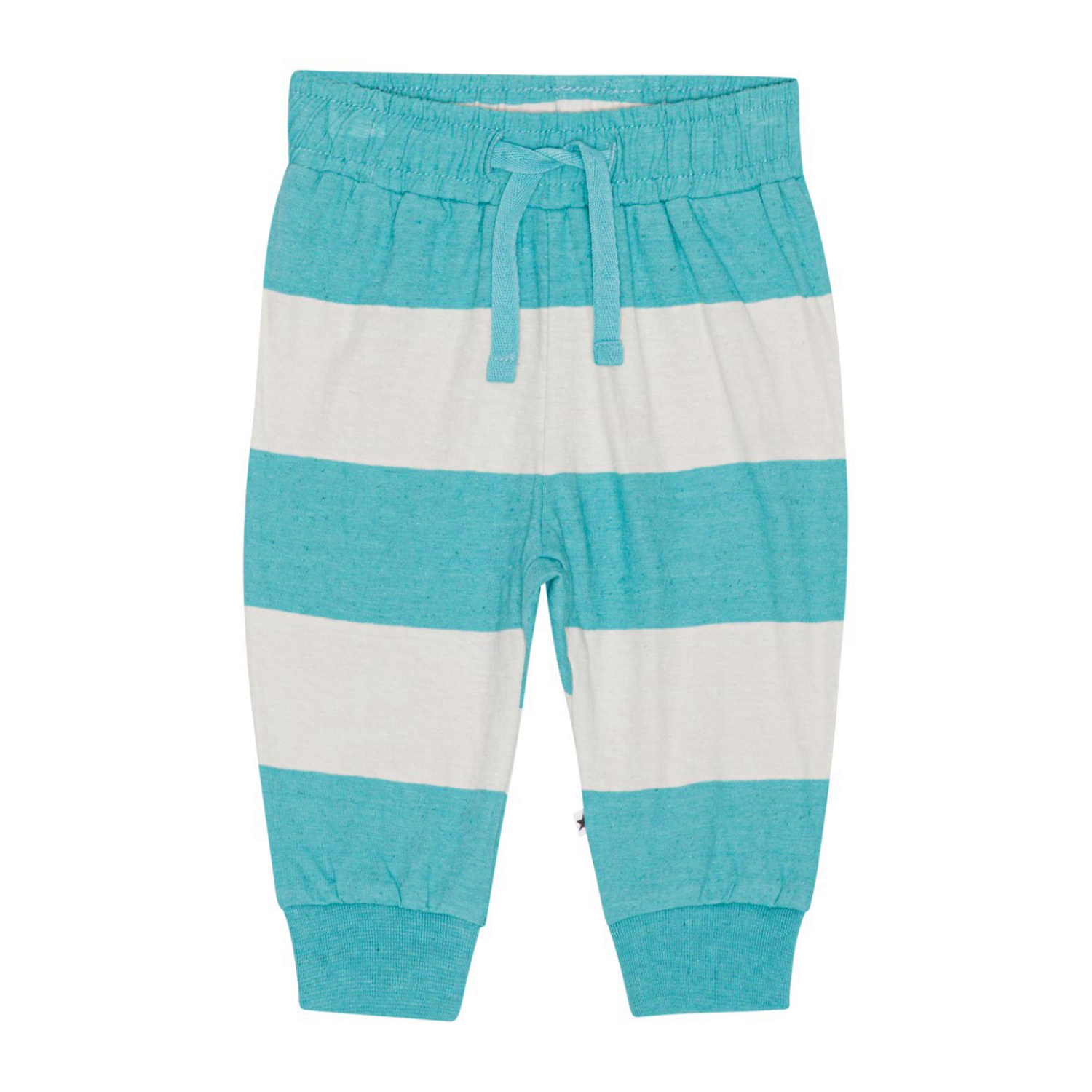 Baby joggingbroekje van een katoenmelange mix met blauwe en zandkleurige strepen Het heeft een elastische taille met koordje en ribboord rond de pijpen. Het is comfortabel en gemakkelijk aan te trekken en je kan je er makkelijk in bewegen. Dit model kan als complete set met het bijpassende t-shirt worden gekocht.