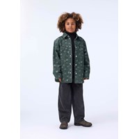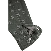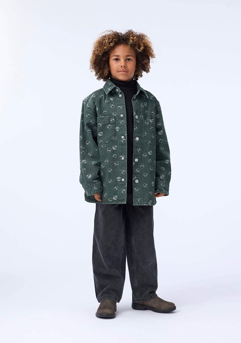 Groene blouse gemaakt van jacquard denim katoenmix met geweven alien patronen in de stof. De blouse heeft twee zakken aan de voorkant en een knoopsluiting en het kan zowel dicht gedragen worden als over een t-shirt als blouse voor een relaxte uitstraling.