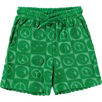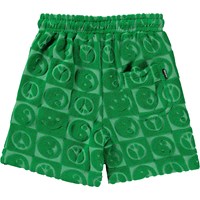 Groene badstoffen korte broek van 100% biologisch katoen met blokjespatroon. Het patroon bestaat uit gelukkige emoji's, Yin Yang symbolen en peace tekens. Deze korte broek is knielengte. Het heeft een elastische taille met koordjes, zijzakken en een enkele achterzak. Het heeft een normale pasvorm. De zachte badstof kwaliteit en de ruime pasvorm van de korte broek is ideaal om te dragen op het strand of bij het zwembad.