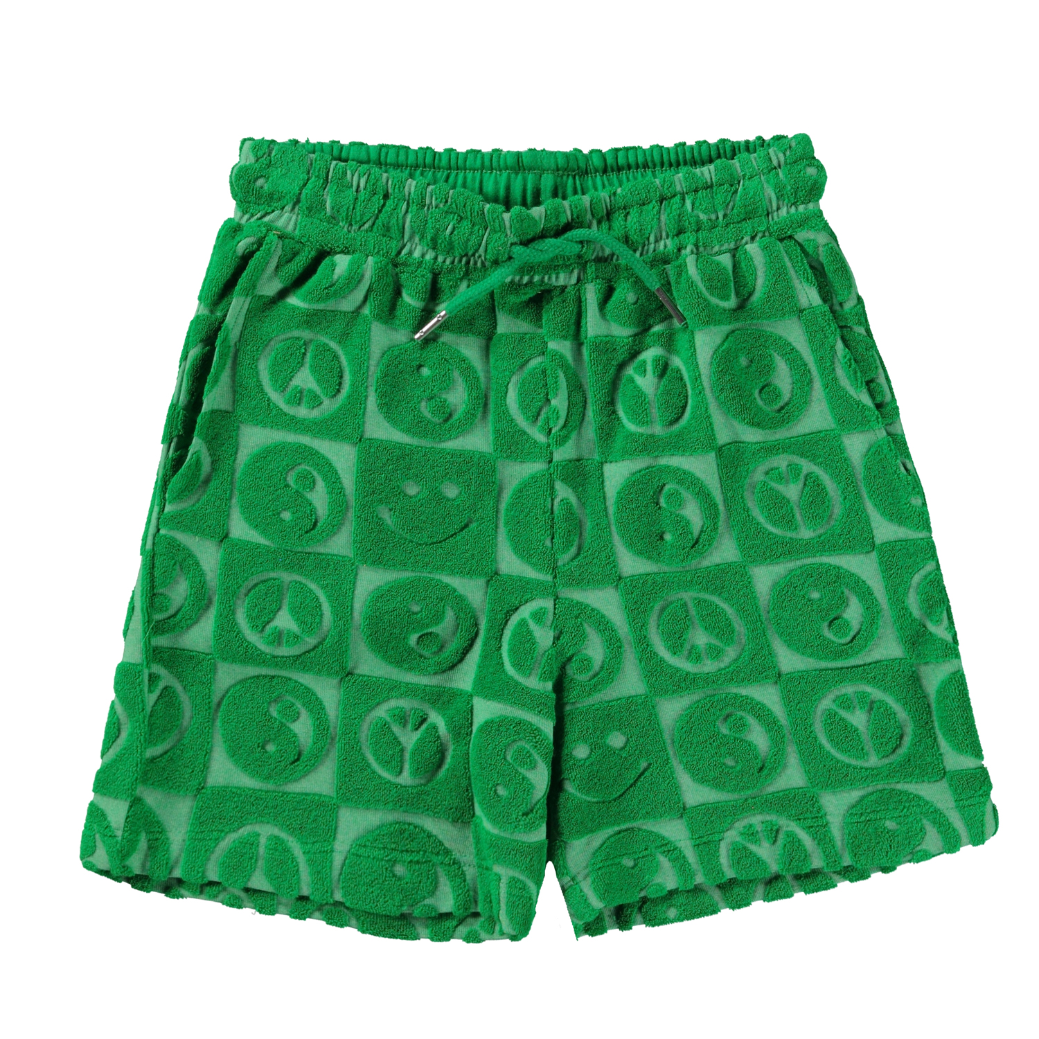 Groene badstoffen korte broek van 100% biologisch katoen met blokjespatroon. Het patroon bestaat uit gelukkige emoji's, Yin Yang symbolen en peace tekens. Deze korte broek is knielengte. Het heeft een elastische taille met koordjes, zijzakken en een enkele achterzak. Het heeft een normale pasvorm. De zachte badstof kwaliteit en de ruime pasvorm van de korte broek is ideaal om te dragen op het strand of bij het zwembad.