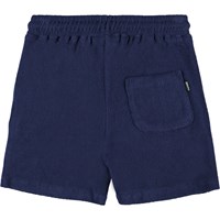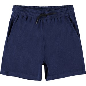 Abay is een donkerblauwe badstof short. De short heeft een ruimvallende pasvorm met zakken aan de zijkanten en een elastische taille met koordjes. Draag het met een bijpassende polo.