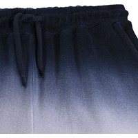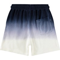 Blauwe, knielange shorts met een dip-dye effect, gemaakt van sneldrogende biologische katoenen badstof. Ze hebben een losse pasvorm, elastische taille met trekkoord, zijzakken en een enkele achterzak. Ideaal voor zowel strand als zwembad.