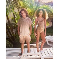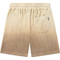 Knielange badstoffen short van biologisch katoen in beige en bruine tinten gemaakt voor actieve kinderen. De short heeft een ruimvallende pasvorm, elastische tailleband met koordje, zijzakken en een achterzak. De zachte katoenen badstof droogt snel en is ideaal voor naar het strand of zwembad.