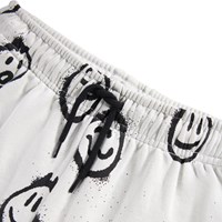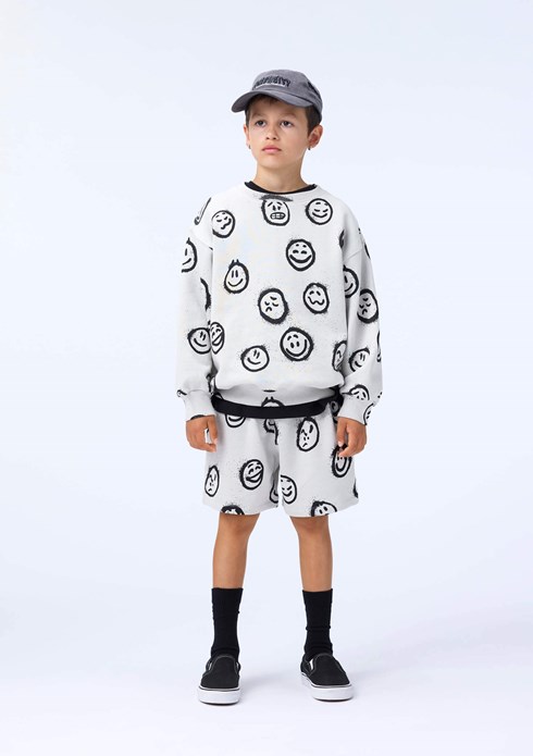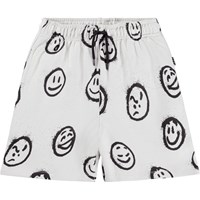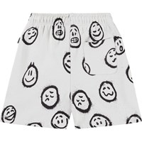 Gebroken witte korte broek gemaakt van biologisch katoen met een print van getekende gezichten. De korte broek heeft een normale pasvorm, valt tot op de knie en heeft wijde pijpen. Het heeft een elastische tailleband met een interne trekkoord, zakken aan de zijkanten en een enkele achterzak. Voor een complete outfit, combineer het met de bijpassende trui.