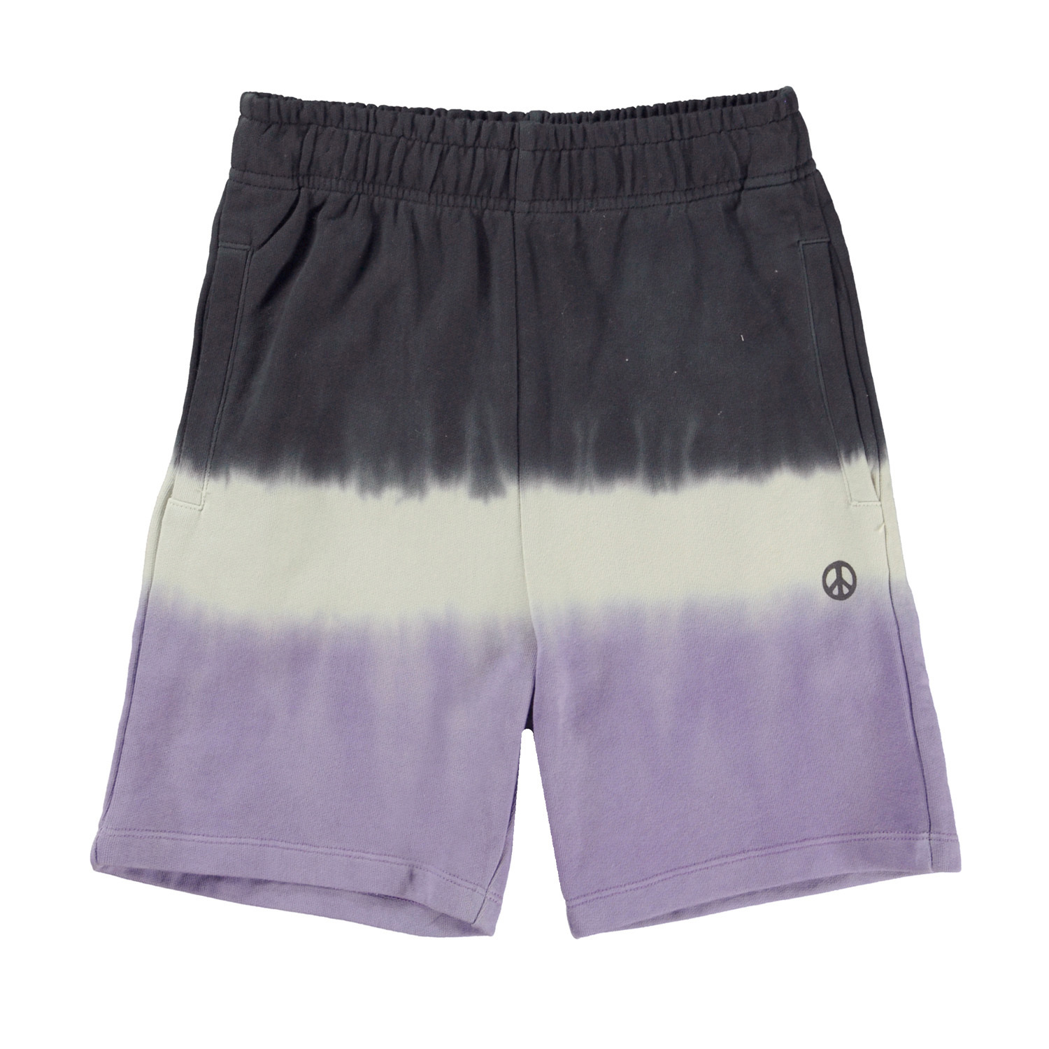 Adian is een unisex short met wijde strepen in het paars, wit en grijs.