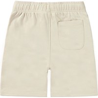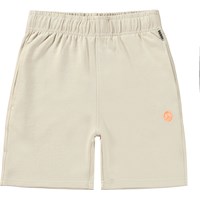 Zandkleurige short van zacht biologisch katoenen jersey. De short is knielengte en heeft een ruimvallende pasvorm. Voor een goede pasvorm heeft het een koordje in de taille. De short heeft steekzakken in de zijnaad, een enkele achterzak en een kleine geborduurde oranje peace teken op de voorkant. Het heeft een baggy look.