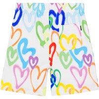Witte short van biologisch katoen met een kleurrijke hartjesprint. De short is wijd, op knielengte en heeft steekzakken in de zijnaad en een enkele zak op de achterkant.