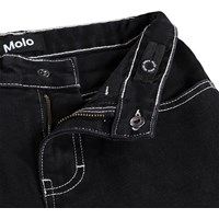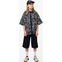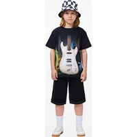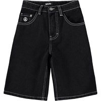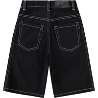 Zwarte korte spijkerbroek gemaakt van biologisch katoen in een relaxte en baggy pasvorm. De korte spijkerbroek komen net boven de knie, heeft vijf zakken en een verstelbare elastische tailleband voor een optimale pasvorm. De kleinste maten (92-134) hebben een drukknoop en de maten 140-176 hebben een klassieke jeansknoop.