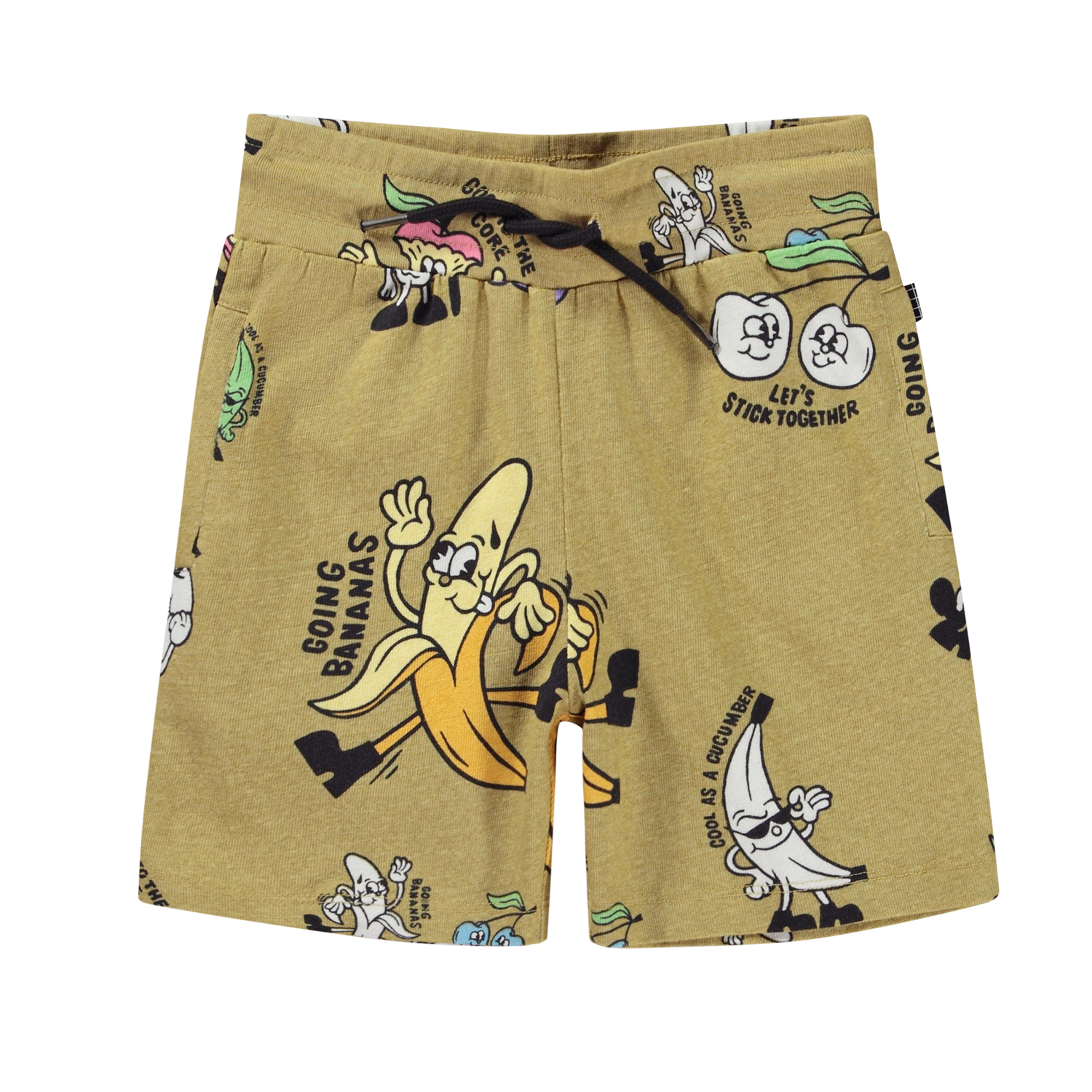 Alw is een groene short in joggingbroek kwaliteit met een print van komisch fruit. Het heeft een ribboord en zwarte koordjes in de taille.