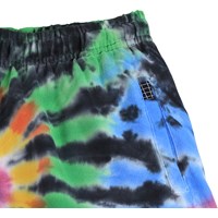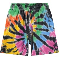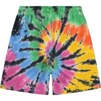 Zwarte shorts met een kleurrijke handgemaakt tie-dye patroon gemaakt van zacht biologisch katoenen jersey. De shorts heeft een elastische taille met een verstelbaar koordje, zijzakken en een ruimvallende en relaxte pasvorm. Let op dat al onze tie-dye handgemaakt is, wat een uniek patroon creëert dat varieert van stijl tot stijl.