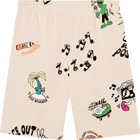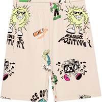 Zandkleurig wijde short van biologisch katoenen jersey. Het valt op knielengte en de ruimvallende pasvorm zorgt dat het goed en comfortabel zit. De short heeft zakken aan de voorkant en een kleurrijke print van leuke stripfiguren, zoals een koele zon, een buitenaards wezen dat een ijsje eet, een dansende speaker en nog veel meer. De figuren zorgen voor een positieve en zomerse sfeer.