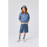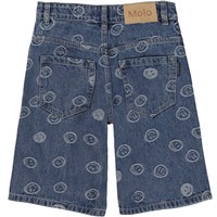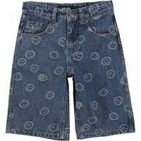 Art is een knielange spijkerbroek in het blauw met een smiley print. Het heeft voor- en achterzakken en een zwarte leren patch met een logo op de achterkant. Dit Molo-product is gemaakt van gecertificeerd biologisch katoen.