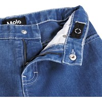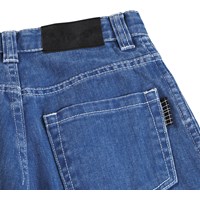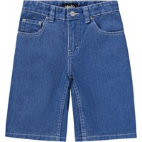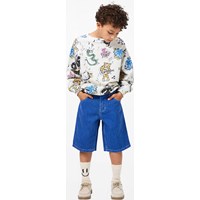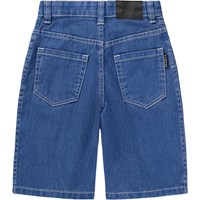 Blauwe, wijde, knielange spijkerbroek gemaakt van zacht biologisch katoen. De korte spijkerbroek heeft zakken zowel aan de voor- als achterkant, een klassieke gulp en een verstelbare elastische tailleband met riemlussen. De kleinste maten (92-134) hebben een drukknoop en de maten 140-176 hebben een klassieke jeansknoop.