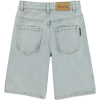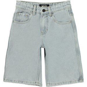 Art is een knielange spijkerbroek in een lichtblauwe wassing. Het heeft voor- en achterzakken en een zwarte leren patch met een logo op de achterkant. Dit Molo-product is gemaakt van gecertificeerd biologisch katoen.