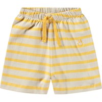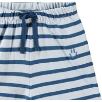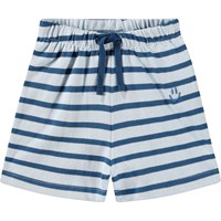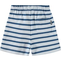 Zachte short van biologisch katoen voor de kleintjes. Het heeft een elastische taille met koordje en ruimvallende pasvorm, voor veel bewegingsvrijheid. De short is gestreept in tinten blauw met aan een kant een geborduurde smiley.