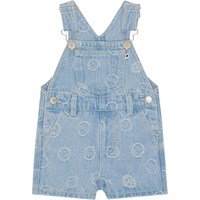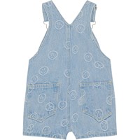 Een tuinbroek van spijkerstof met kleine lachende gezichtjes in de stof geweven. Het is knielang, heeft verstelbare bretels met gespen, een drukknoopsluiting aan de zijkanten en voor- en achterzakken.