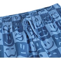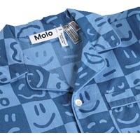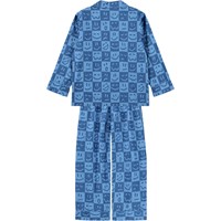 Blauw geruite pyjama gemaakt van zacht biologisch katoen met lange mouwen en pijpen. Het shirt heeft een borstzak, kraag en knopen en de pyjamabroek heeft elastiek en een koordje in de taille. De pyjama heeft een humoristische print van gezichten met verschillende uitdrukkingen.