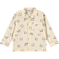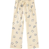 Gebroken witte pyjama met lange mouwen en pijpen van biologisch katoen. De top heeft een ruimvallende pasvorm, een button-down kraag, een borstzakje en manchetten aan de mouwen. De broek heeft een ruimvallende pasvorm en elastiek en een koordje in de taille. De pyjama heeft een all over print van lachende donkerblauwe smiley's.