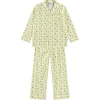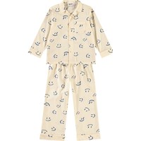 Gebroken witte pyjama met lange mouwen en pijpen van biologisch katoen. De top heeft een ruimvallende pasvorm, een button-down kraag, een borstzakje en manchetten aan de mouwen. De broek heeft een ruimvallende pasvorm en elastiek en een koordje in de taille. De pyjama heeft een all over print van roze aardbeien en witte bloemen, die samen een prachtig patroon vormen.