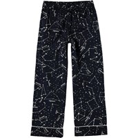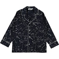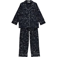 Donkerblauwe pyjama met lange mouwen en een print van een kaart met sterrenbeelden. De broek heeft koordjes in de taille.